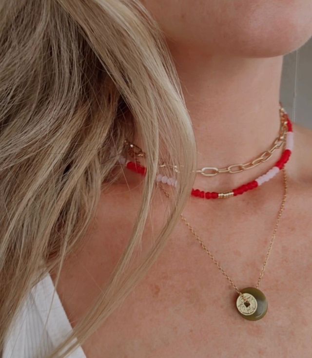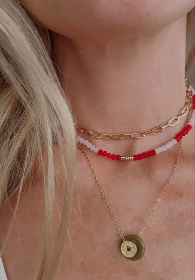 DETALLE: Choker cadena de 35 cm de diámetro. Collar en crista rosa y rojo. Material de cadena y dijes en goldfield. Semilla Tagua.