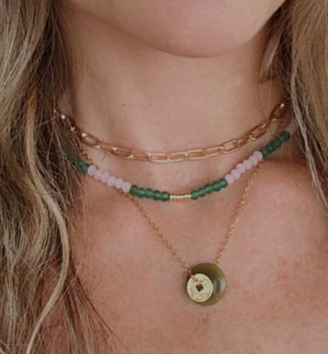 DETALLE: Choker cadena de 35 cm de diámetro. Collar en crista rosa y verde. Material de cadena y dijes en goldfield. Semilla Tagua.