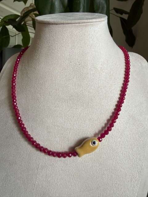 DETALLE: Collar de 42 cm. Piedra: rubí. Material de cadena en goldfield. Dije en vidrio.