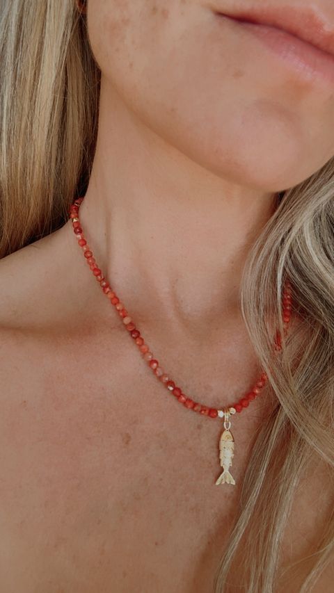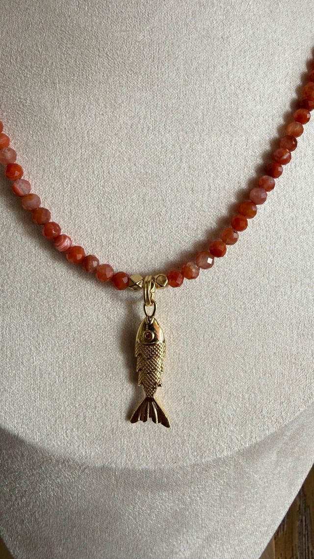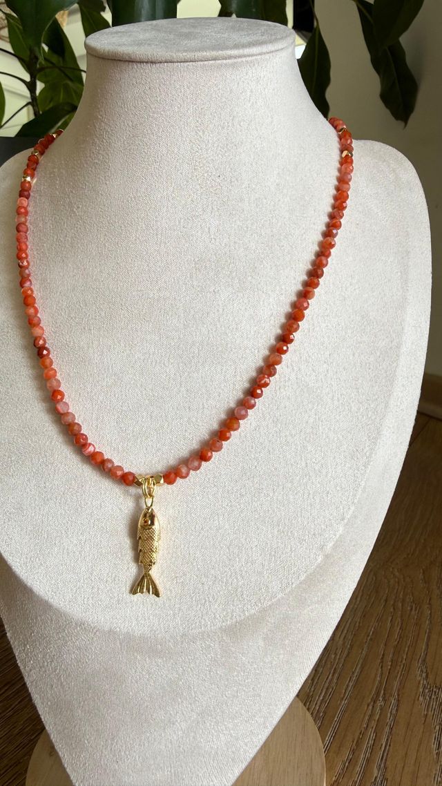DETALLE: Collar de 44 cm. Piedra: ágata color anaranjada. Material de cadena y dije en goldfield.